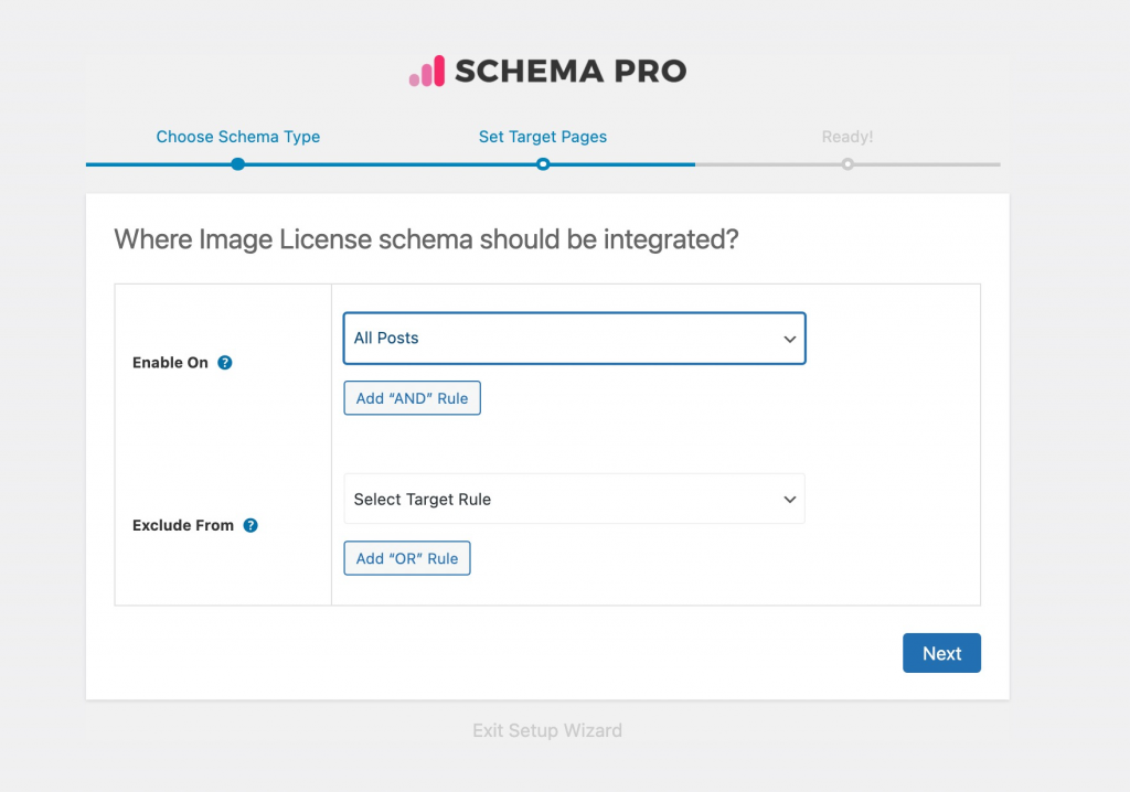 Want to add licensing to images across your website or on specific pages and posts? Do so quickly using the ‘Enable On’ or ‘Exclude From’ options. Click Next when you are done.