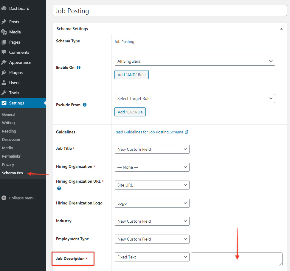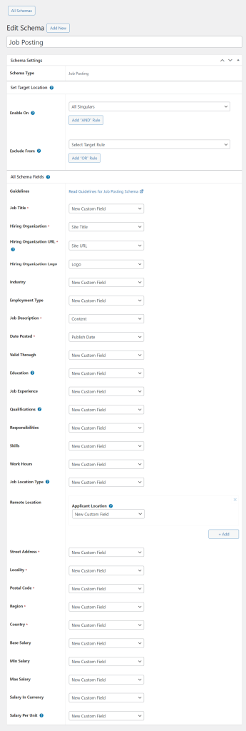 Step 5: In Schema Settings, you will see various fields related to job posting schema. These fields help you enter details about available jobs. We recommend you make sure that all schema fields are put on the right values.