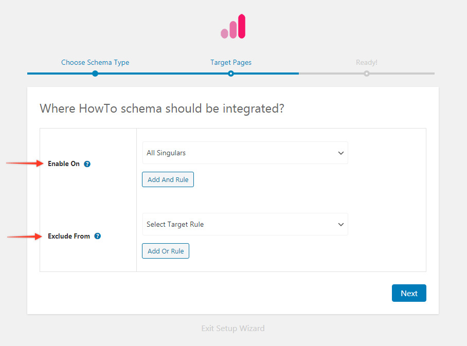 Step 3. Select the pages/posts that you want to apply this HowTo markup to. You can add display rules and also exclude pages and posts you want to exempt this schema from.