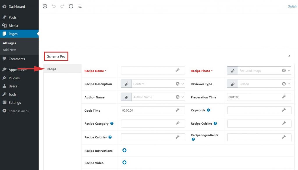 Step 5. In Schema Settings, you will see various fields related to recipe schema. These fields help you enter details about your dish. We recommend you make sure that all schema fields are put on the right values.