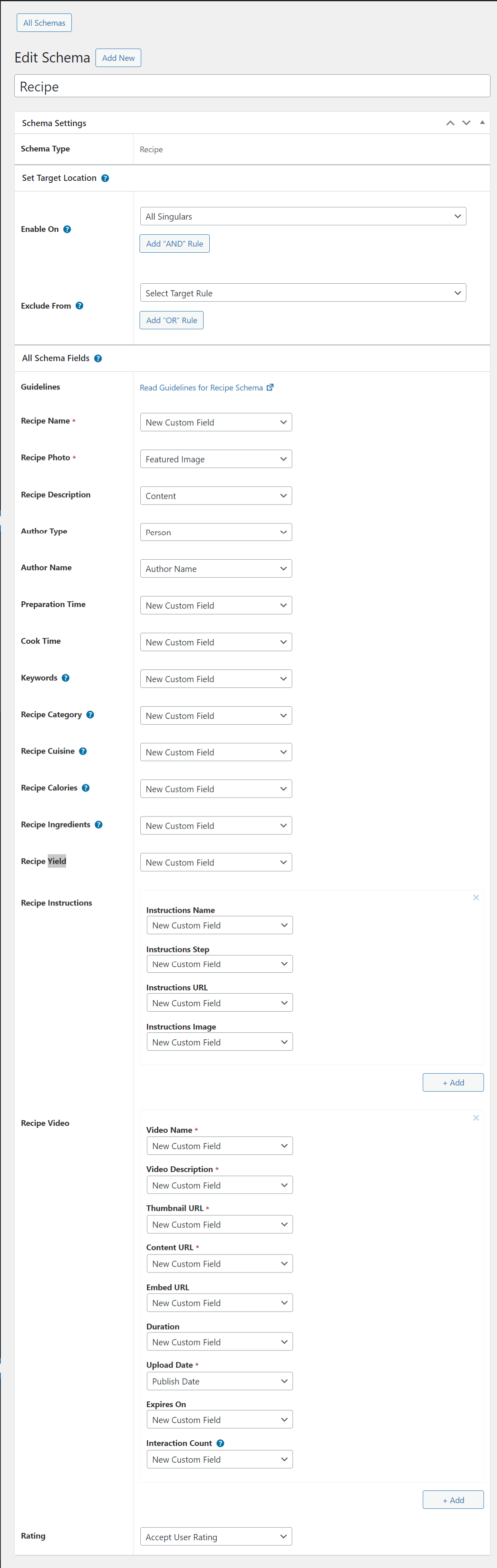 By default, all fields will fetch values from schema under Settings > Schema Pro > Recipe but you can also change this and choose other values from the list or set the values manually.