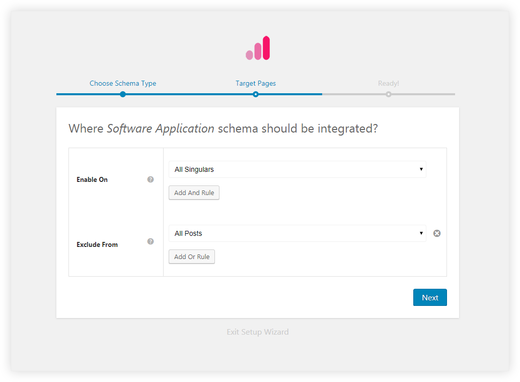 Step 3. Select the pages/posts that you want to apply this markup to. You can add display rules and also exclude pages and posts you want to exempt this schema from.