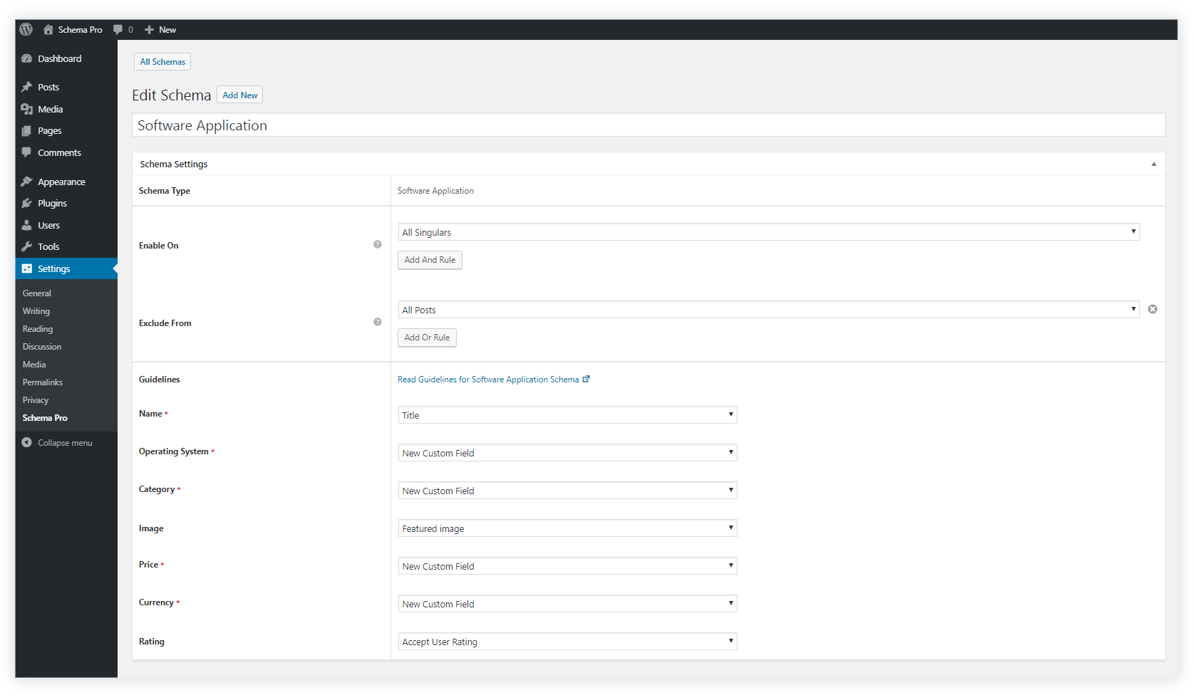 Step 5. In Schema Settings, you will see various fields related to the software application schema. These fields help you enter details about your software application. We recommend you make sure that all schema fields are put on the right values.