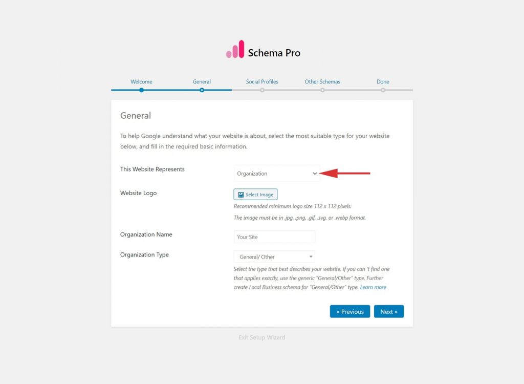 In the Schema Pro setup wizard, on the General screen, you can select the most suitable type for your website. This helps Google to understand what your website is about.