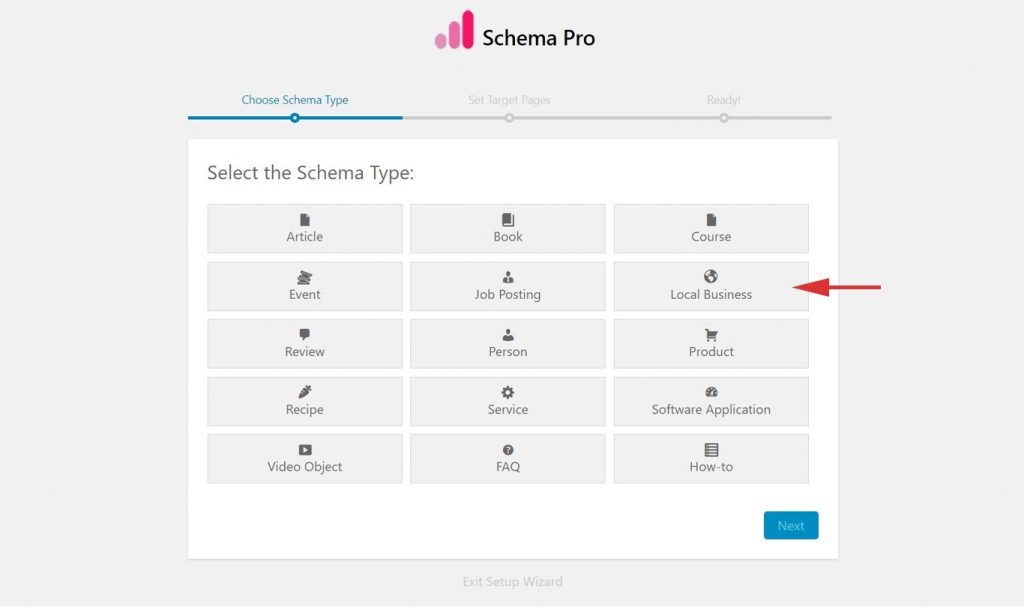 In case you exit the setup wizard you can find option in dashboard under Schema Pro > Schemas. Here you can create a new schema and select Local Business type.