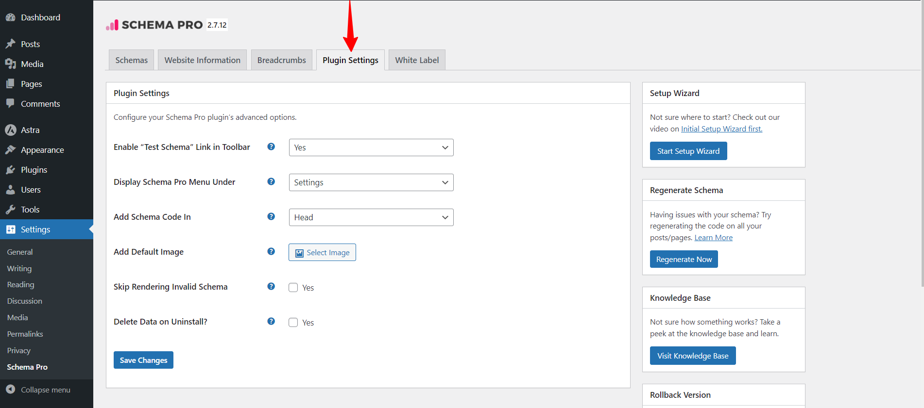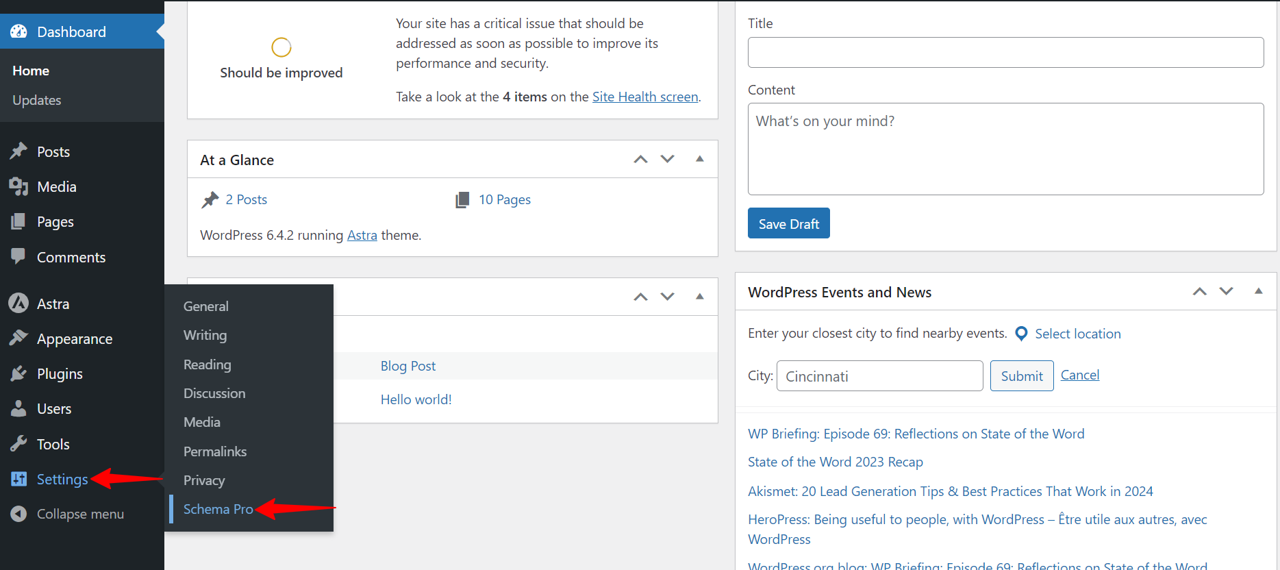 2. Click “Schema Pro” from the settings option in your WordPress dashboard.