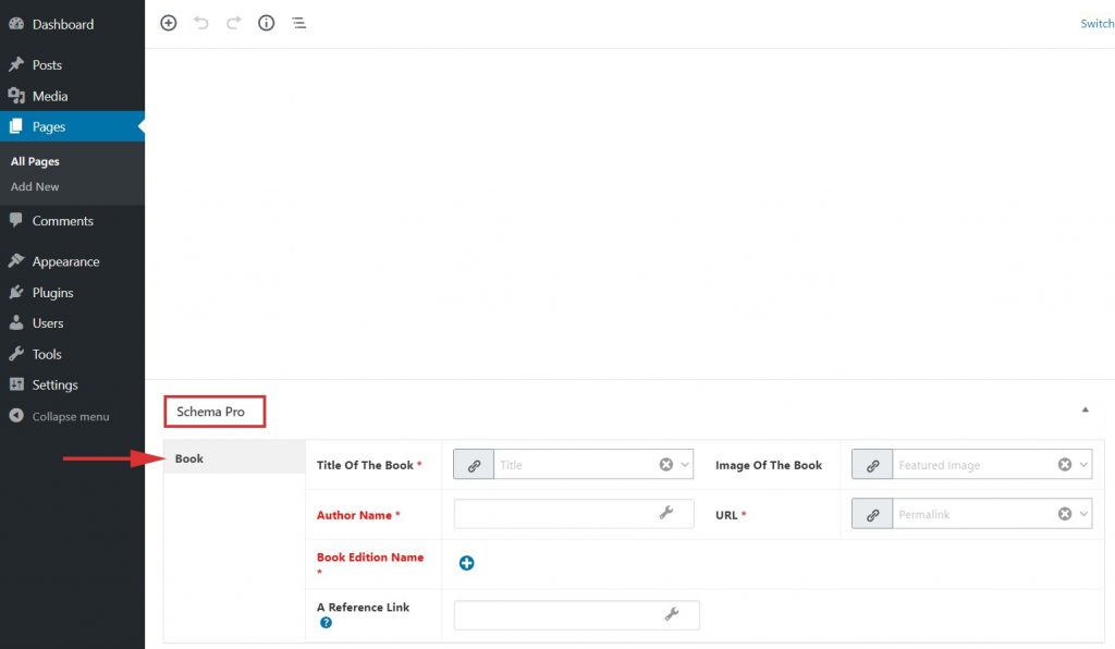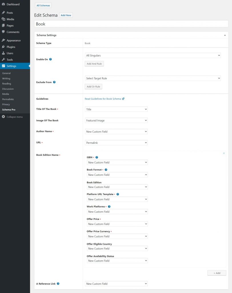 Step 5: In Schema Settings, you will see various fields related to book schema. These fields help you enter details about your book. We recommend you make sure that all schema fields are put on the right values.