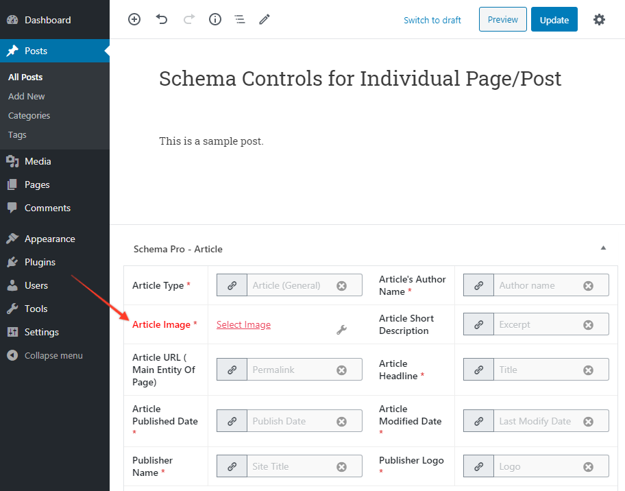 Schema Pro version 2.0, makes all schema fields available on single pages and posts. Editing single page/post you will see all schema fields available for editing.