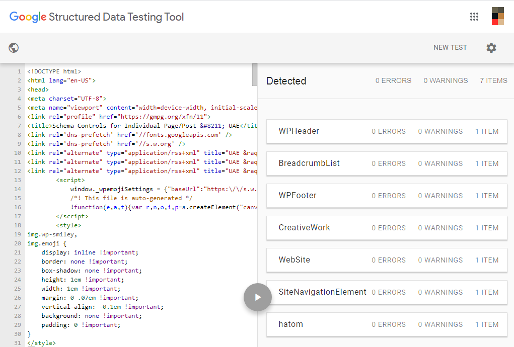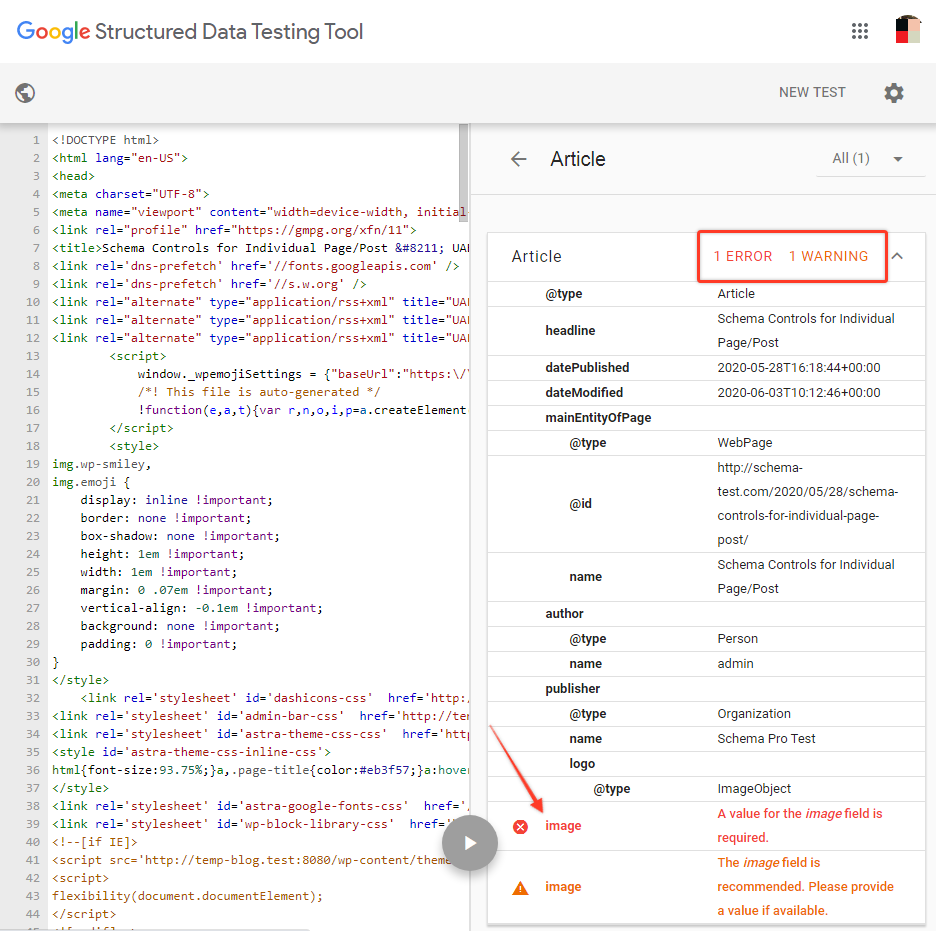 In our example, enabling option will skip rendering Article schema on a the page. And the Google’s Structured Data Testing Tool will look like –